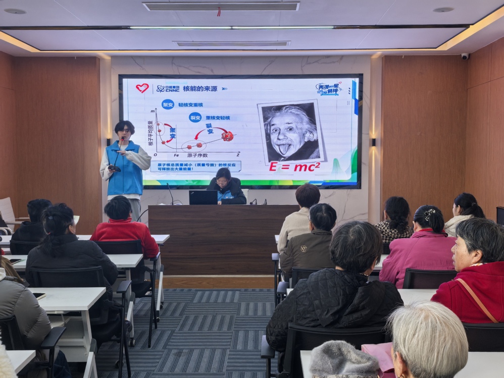 为普及核能知识,提升公众对核能源的认识,弘扬“两弹一星”精神,11月18日下午,湖州师范学院马克思主义学院“政”青春宣讲团走进白鱼潭社区党群服务中心,以“‘人造太阳’点燃能源梦想”为主题,为社区居民宣传核能源的独特魅力。