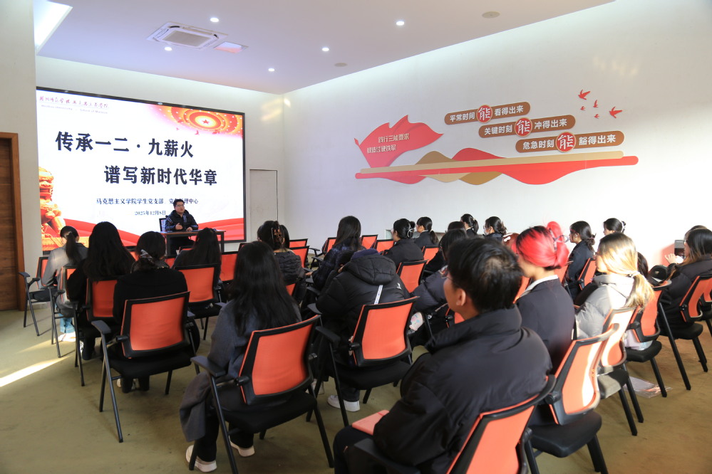 在微党课学习环节,杨泽峰老师以“一二・九运动与青年担当”为主题开讲专题微党课。他紧密结合自身学习体会,立足历史与当下的时代背景,深入剖析一二・九运动的精神内核,系统解答了新时代大学生应当如何锚定时代方位、扛起时代重任的关键问题,为在场师生带来了一堂兼具理论深度与实践指导意义的红色思政课。现场学生围绕“新时代如何传承一二・九精神”这一核心议题,积极开展交流探讨与心得分享。大家各抒己见、思想碰撞,在互动中深化了对红色精神的理解,凝聚了青年一代传承红色血脉的共识。