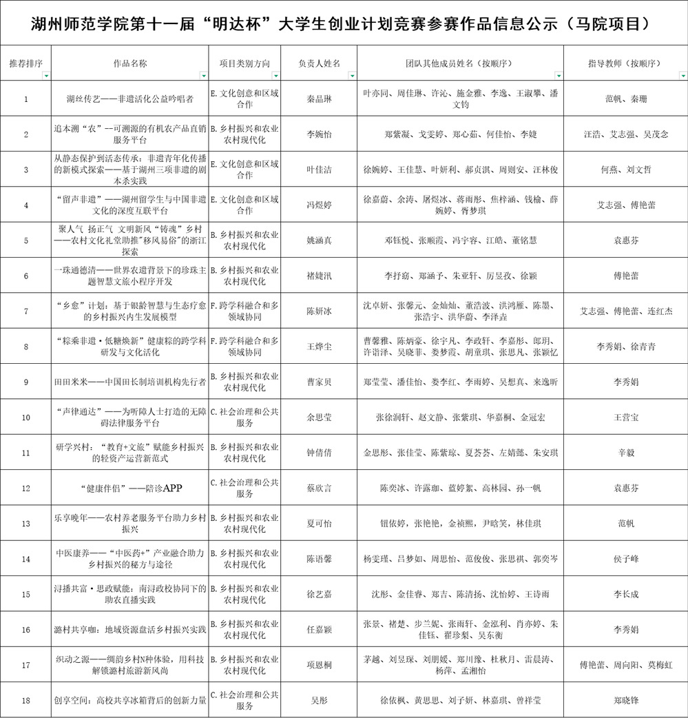 根据学校《关于开展湖州师范学院第十一届“明达杯”大学生创业计划竞赛的通知》要求,经个人申报、学院审核、评委评审,现将拟推荐项目信息进行公示。